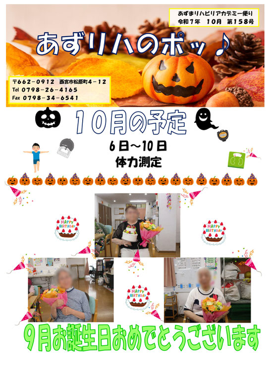 朝晩は涼しくなってきましたが、まだまだ残暑続いていますね、身体をこわさないよう服装に気をつけて体調を整えていきましょう。 あずリハのポッ10月号が完成しました。ぜひご覧ください。